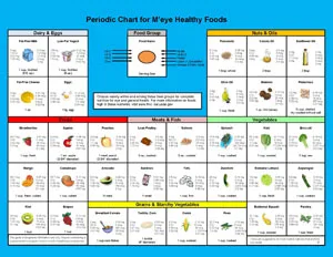 A variety of common foods are featured in the My Eye Diet Periodic Table. Each square contains a different food with serving size and nutrient content that are of interest to eye health. The back side provides the requirements, dietary sources and symptoms of deficiency and toxicity for these nutrients.- Size: 8.5″ x 11″